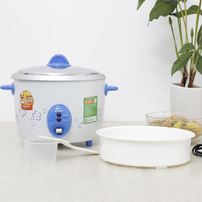 Nồi cơm điện Sharp KSH-D19V có kiểu dáng hiện đại, đơn giản mà cứng cáp, thân nồi màu trắng trang nhã. Trang trí hình bông hoa 5 cánh sinh động, tay cầm, quai núm, hộp công tắc có màu xanh tươi sáng, trẻ trung, góp phần tô điểm thêm cho gian bếp nhà bạn thêm sáng sủa, thời trang.
