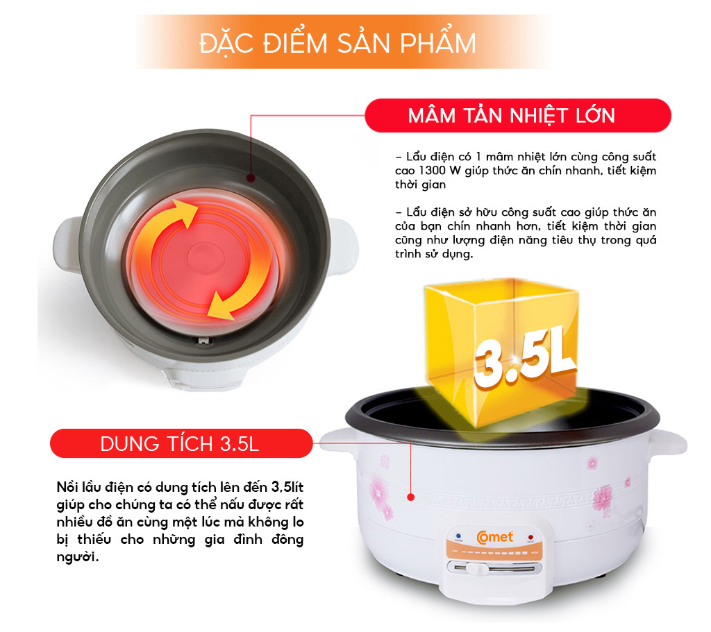 - Nồi lẩu điện Comet CM7731 với dung tích lớn 3.5 lít phù hợp với những bữa liên hoan nhẹ cuối tuần hay sinh nhật, tiệc tùng.