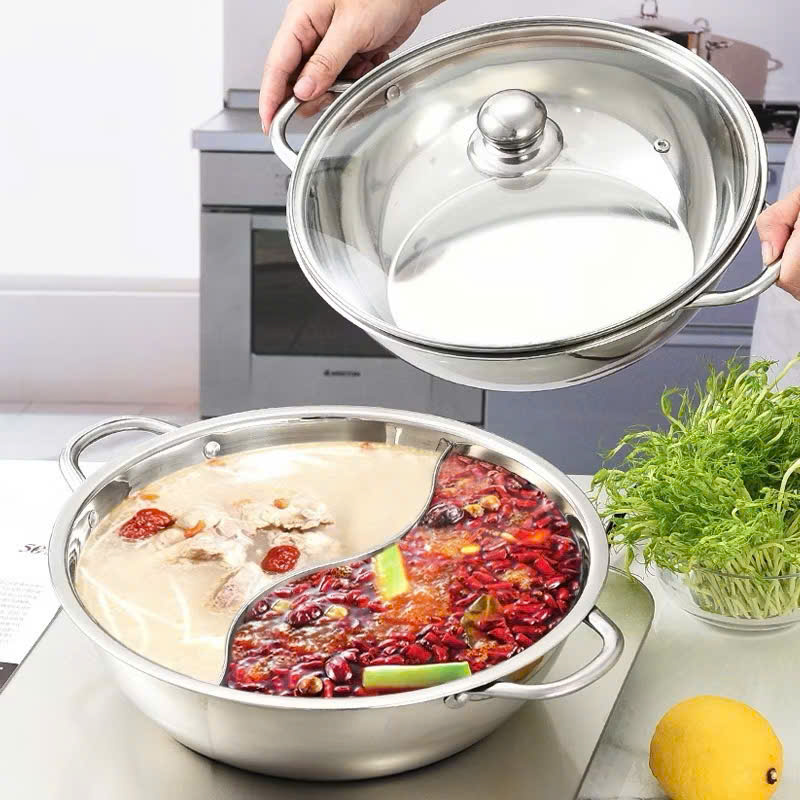 Mua tại TiktokNồi Lẩu Inox 2 Ngăn 30cm Nấu Được Bếp Từ và Bếp Gas, Có Nắp Kính Chất Lượng Cao