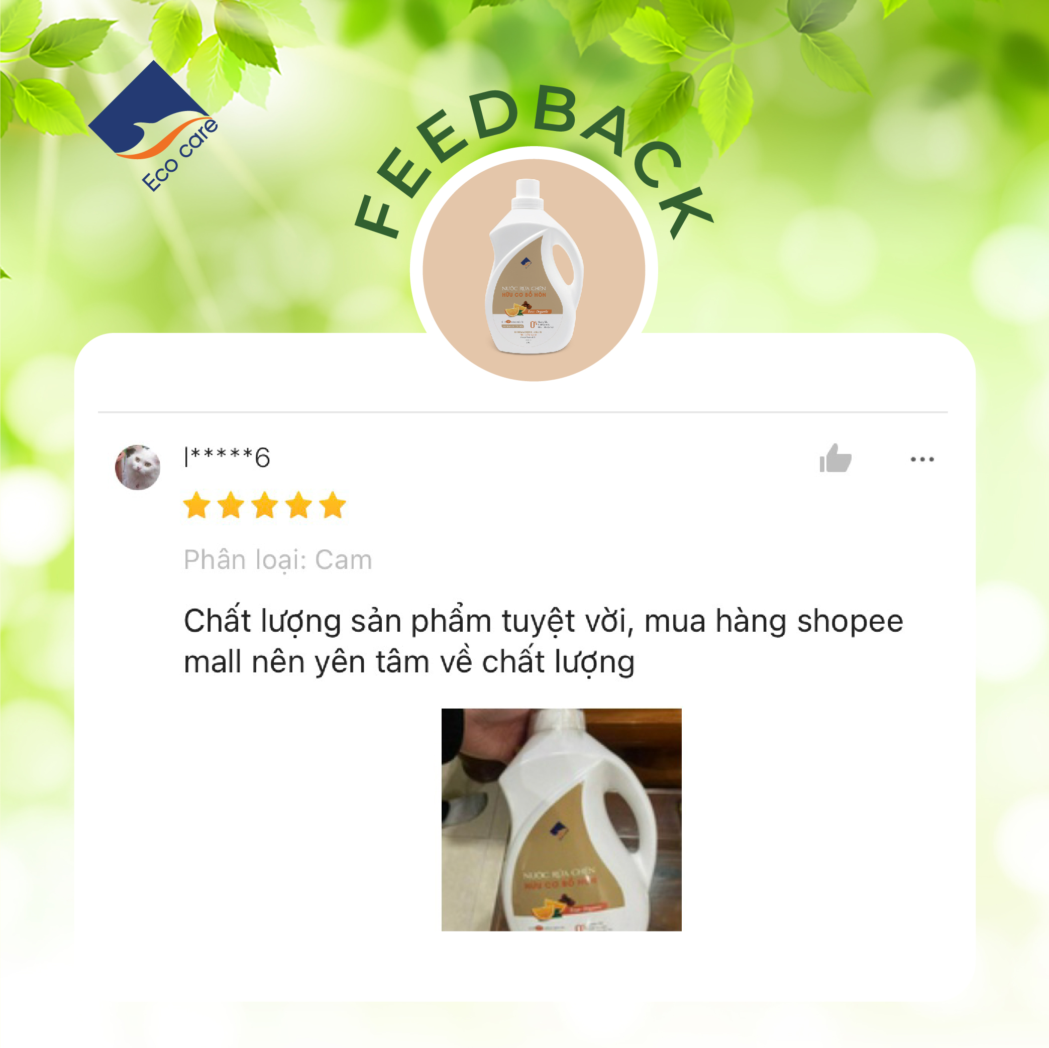 • Trước tiên, Công ty Ecocare xin cảm ơn Quý Khách hàng đã tin tưởng lựa chọn sản phẩm Nước rửa chén hữu cơ Bồ hòn tinh dầu Cam 4000ml