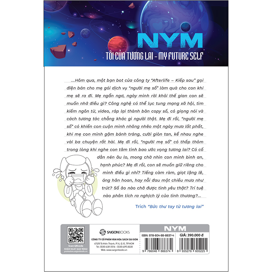 Với NYM – Tôi của tương lai, tác giả Nguyễn Phi Vân sẽ khiến chúng ta đi lạc vào một thế giới mới: nơi một “con robot” luôn tự nhận mình là người hơn một con người; nơi hai AI bàn luận về sex; nơi AI giải nghĩa cho chúng ta những phát minh sẽ định hình thế kỷ mới