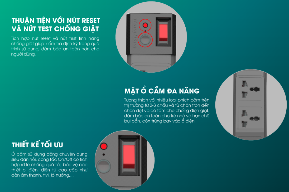 - Bảo vệ an toàn chống xung điện áp cao, xung sét. - Công tắc tích hợp rơ le chống quá tải 15A. - Ổ cắm đa năng sử dụng đồng chuyên dụng siêu đàn
