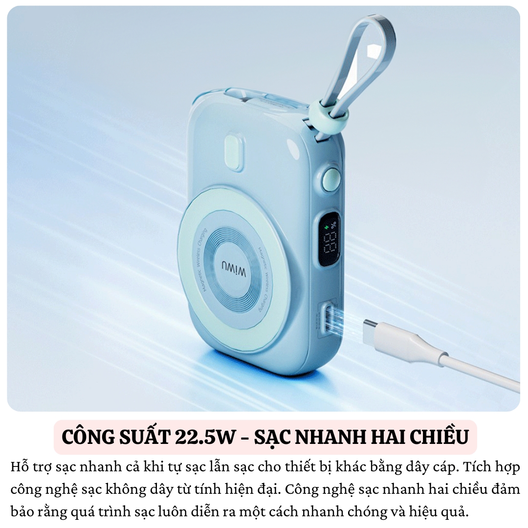 Sức Mạnh Tuyệt Đối, Sạc Nhanh 22.5W: WIWU W-P049 hỗ trợ sạc nhanh 22.5W với khả năng sạc hai chiều. Dù bạn đang tự sạc hoặc sạc thiết bị khác, tốc độ sạc nhanh chóng chỉ trong 3 giờ, giúp tiết kiệm thời gian và giải quyết mọi phiền toái khi sạc.