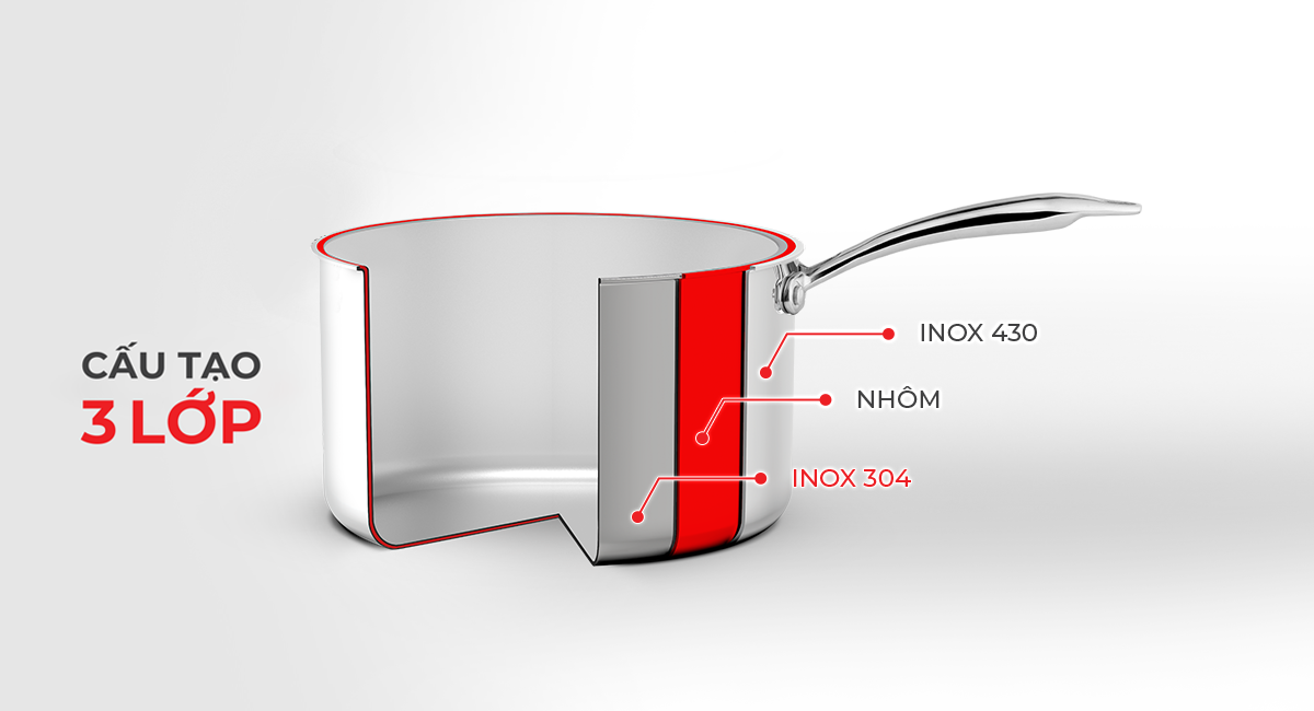 Quánh inox 3 lớp cao cấp đáy liền Tri-max được làm từ Inox 304, chống ăn mòn cao, không tác dụng với thức ăn, không thôi nhiễm, giải phóng các chất độc hại, tuyệt đối