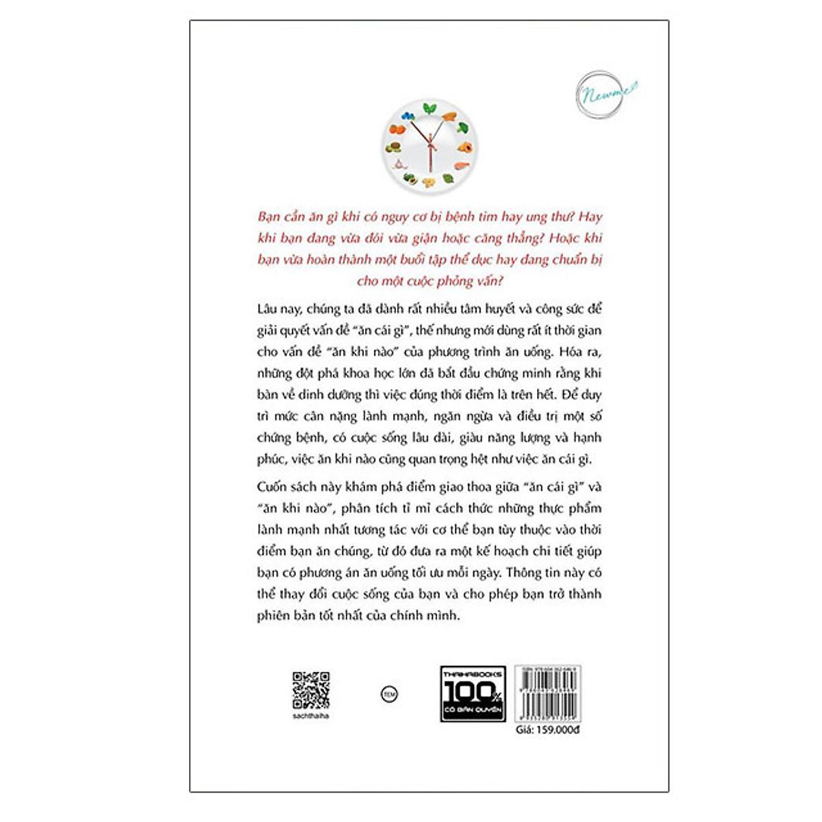 [ThaiHaBooks] Mọi người đều biết ảnh hưởng của thực phẩm đến sức khỏe, nhưng ít ai quan tâm đến thời điểm ăn uống. Cuốn sách Ăn gì khi nào khám phá điểm giao thoa giữa “ăn cái gì” và “ăn khi nào”, phân tích tỉ mỉ cách thức những thực phẩm lành mạnh nhất tương tác với cơ thể bạn tùy thuộc vào thời điểm bạn ăn chúng, từ đó đưa ra một kế hoạch chi tiết giúp bạn có phương án ăn uống tối ưu mỗi ngày.