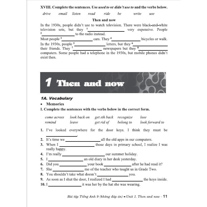 Bài tập Tiếng Anh 9 – Không đáp án gồm một bài ôn tập củng cố kiến thức đã học (Starter Unit), và 8 đơn vị bài học chính: Then and now; Lifestyles; Our surroundings; Feelings; English and world discovery; The self; On the streets; Scary. Sau mỗi đơn vị bài học đều có bài ôn tập Review. Bài tập dành cho mỗi đơn vị bài học chính gồm 6 phần: Vocabulary,