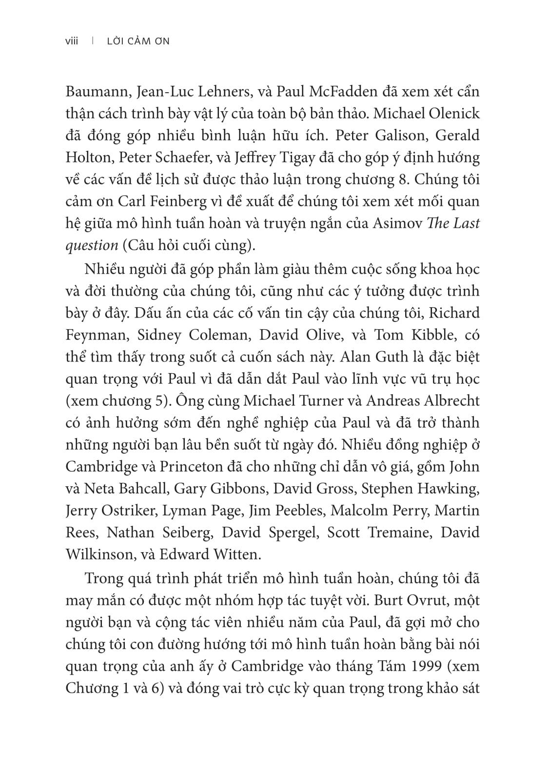 Trong Vũ trụ Tuần hoàn, Paul J. Steinhardt và Neil Turok, hai nhà vật lý xuất sắc, đã đưa ra một vũ trụ học hoàn toàn mới. Steinhardt và Turok “khẳng định rằng chúng tôi nghĩ, cái gọi là thời điểm sáng thế chỉ đơn giản là một phần của một chu kỳ vô tận các va chạm khủng giữa vũ trụ của chúng ta và một thế giới song song"). Họ điểm lại những phát triển ấn tượng trong thiên văn, vật lý hạt, và lý thuyết siêu dây, chúng tạo thành cơ sở cho lý thuyết “Vũ trụ Tuần hoàn” đột phá nền tảng. Theo lý thuyết này, Big Bang không phải là khởi đầu của thời gian, mà chỉ là chiếc cầu bắc về quá khứ với biết bao chu kỳ tiến hóa lặp lại vô tận, mỗi chu kỳ lại tái diễn quá trình tạo thành vật chất mới và hình thành các thiên hà, các ngôi sao, và các hành tinh mới