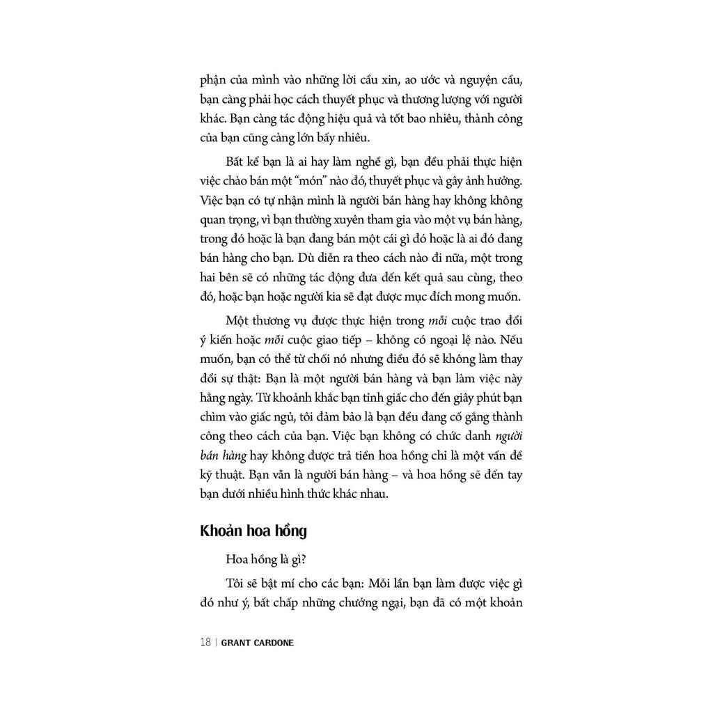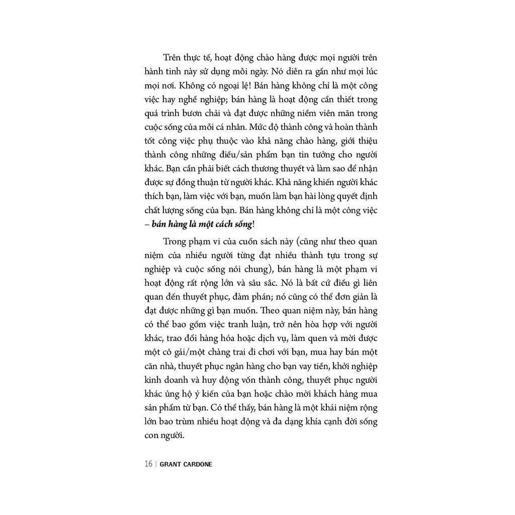 Trong từng trang sách, tác giả Cardone giới thiệu và phân tích kỹ lưỡng những kỹ thuật và bước tiếp cận thiết yếu để bạn có thể làm chủ nghệ thuật bán hàng trong mọi tình huống. Bạn sẽ học được cách xử trí khi bị khách hàng từ chối, cách lật ngược tình thế, rút ngắn quy trình bán hàng và làm sao để bản thân ngày càng chuyên nghiệp hơn. Cardone cũng sẽ chỉ cho bạn thấy đâu là những yếu tố quyết định thành công, sẽ luôn giúp bạn: