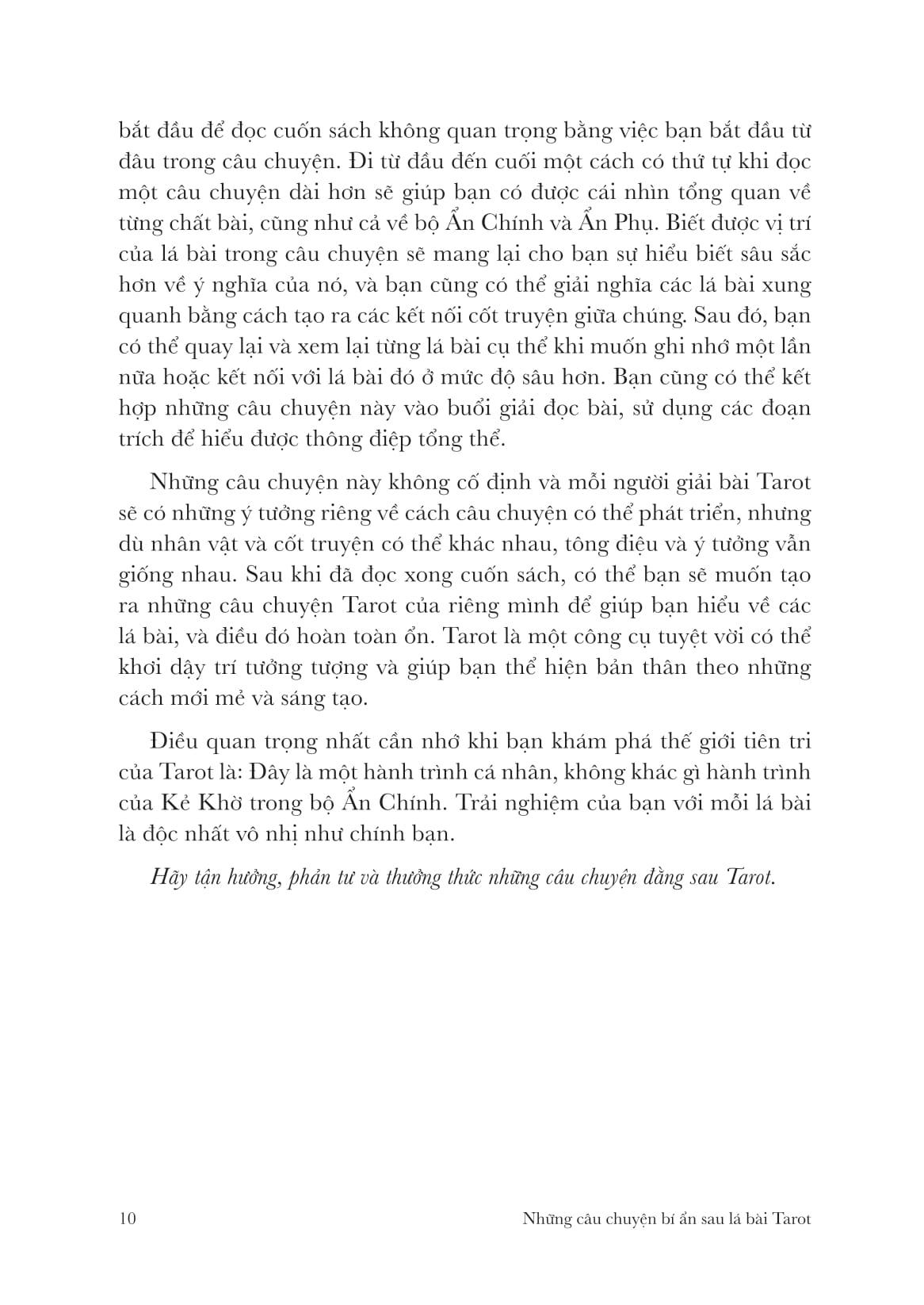 Tarot không đơn giản chỉ là những lá bài đầy màu sắc; đó là một vũ trụ huyền bí, mê hoặc và ẩn chứa nhiều thông điệp sâu sắc. Mỗi lá bài đều có một câu chuyện riêng, những biểu tượng tâm linh kết hợp với nhau một cách tài tình, trở thành một công cụ tuyệt vời để bạn khám phá câu chuyện của một ai đó hoặc của chính m.ình. Những câu chuyện bí ẩn sau lá bài Tarot của tác giả - chuyên gia kể chuyện Alison Davies sẽ dẫn dắt bạn bước vào hành trình Tarot màu nhiệm ấy, hướng dẫn bạn kết nối với các hình ảnh của từng lá bài trong bộ bài Rider-Waite Smith, để hiểu sâu – nắm chắc – cảm nhận được trọn vẹn nhất một bộ bài Tarot.