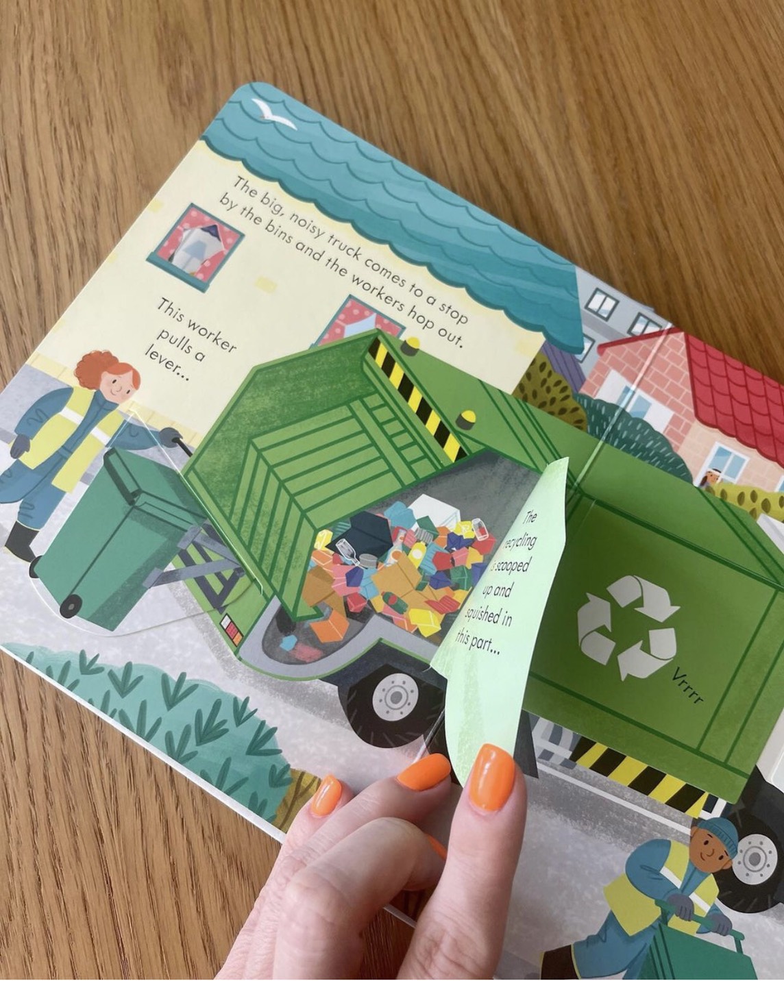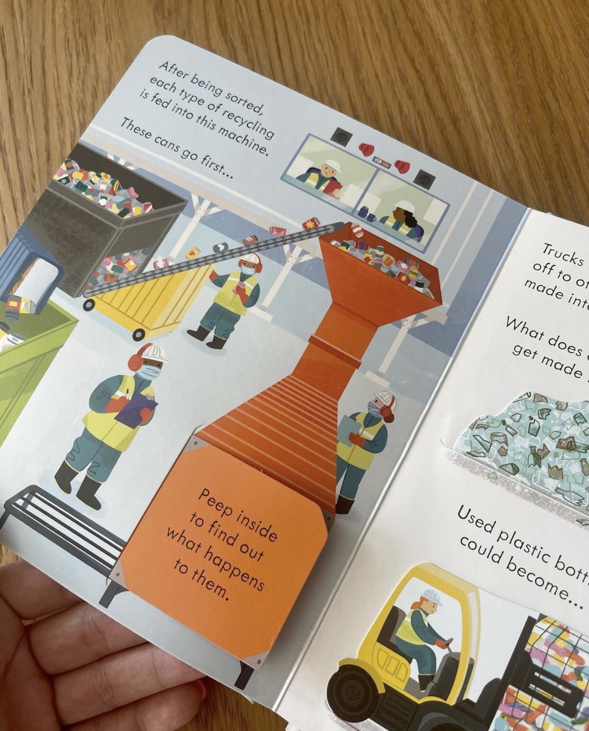 ✨Sách tương tác tiếng anh cho bé - Usborne Peep Inside how a recycling truck works