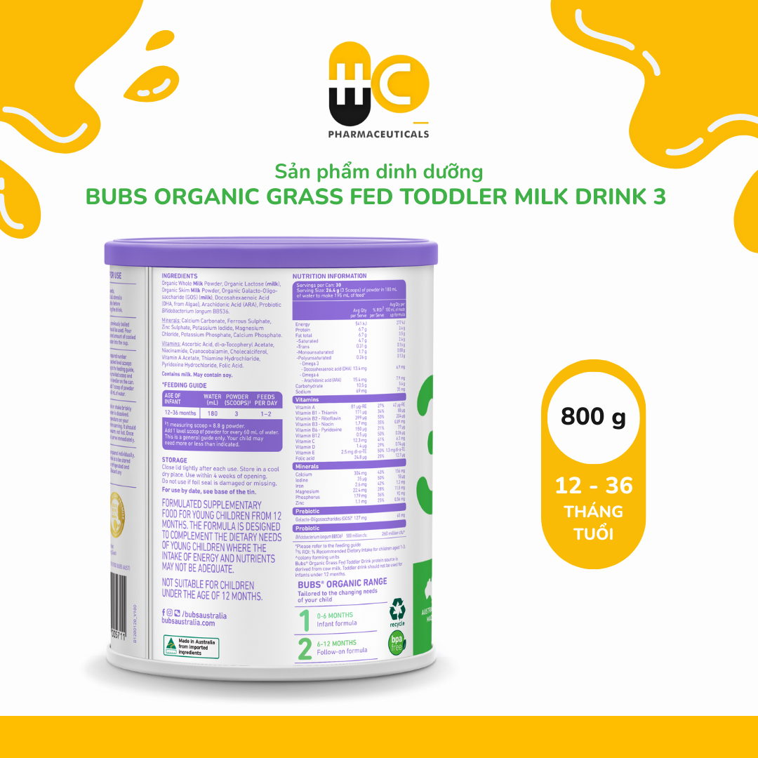 Sản phẩm dinh dưỡng công thức hữu cơ Bubs Organic Grass Fed Toddler Milk Drink 3 (12–36 tháng tuổi) – Hộp 800g Đặc điểm nổi bật - Công thức hữu cơ từ Úc, nguồn sữa