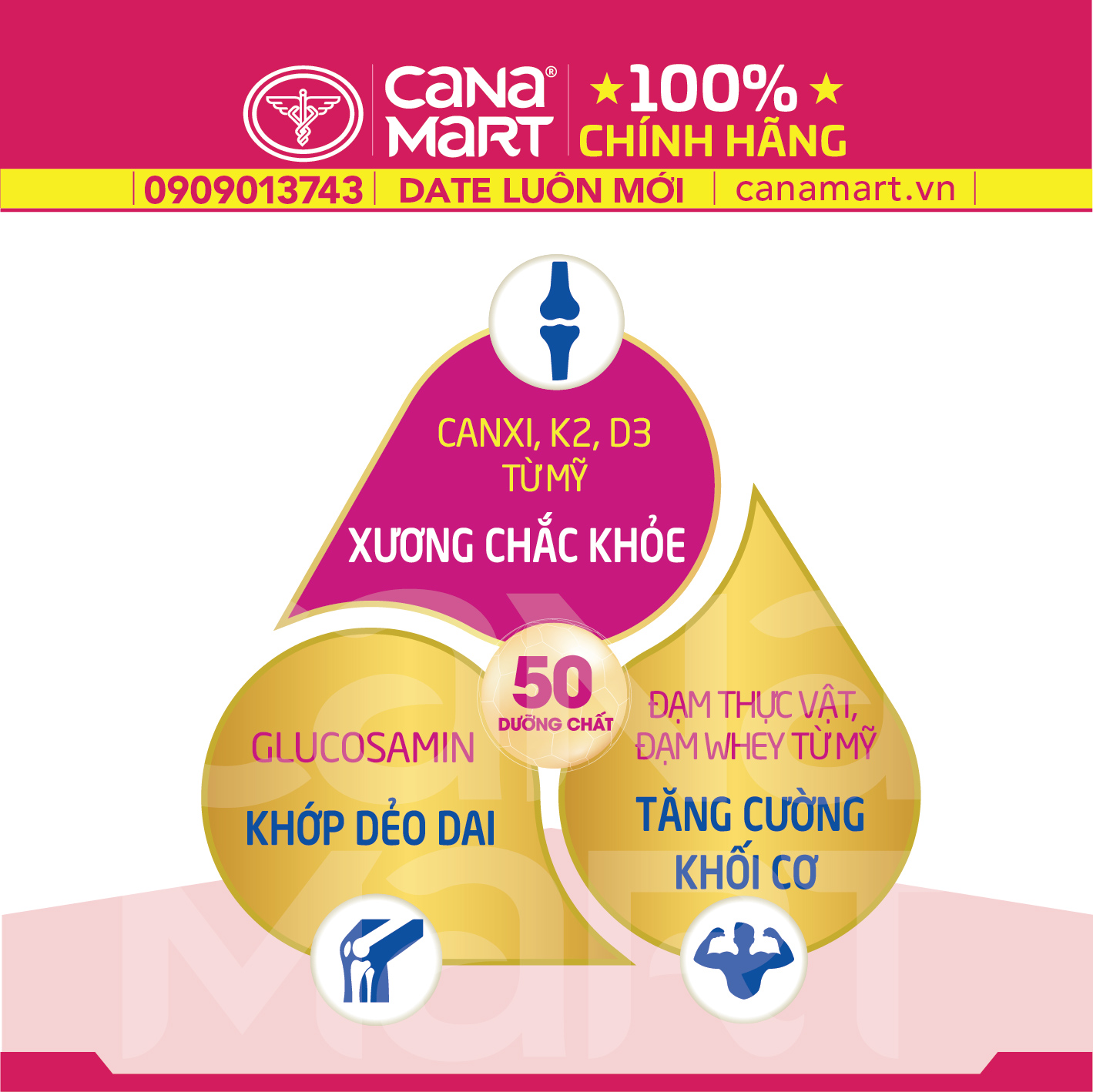 Công dụng TỐT CHO CƠ - XƯƠNG: Giàu đạm quý Arginine & BCAA giúp tưng cường hệ cơ. Giàu Canxi, vitamin D3 cùng Magie, đặc biệt tỷ lệ Canxi/Phospho đạt chuẩn khuyến nghị Quốc gia