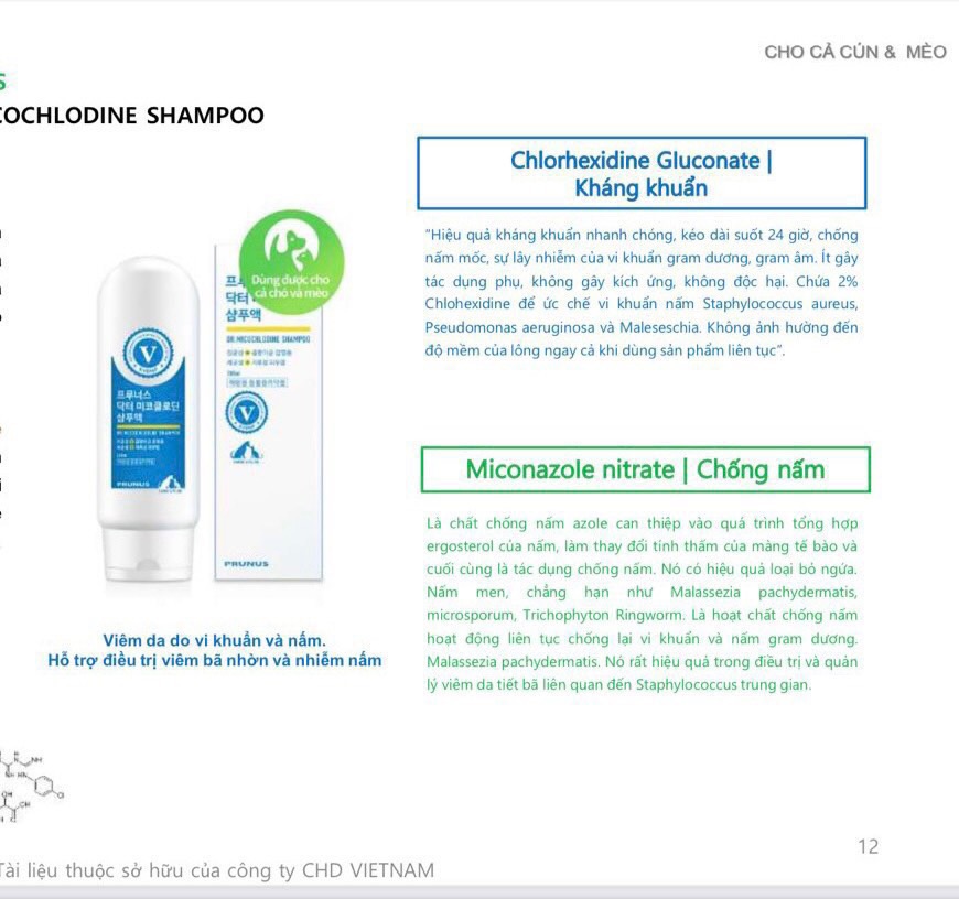 Hiệu quả: Hỗ trợ điều trị viêm da do vi khuẩn và viêm bã nhờn ở chó và mèo và nhiễm nấm và ngăn ngừa tình trạng lây nhiễm vi khuẩn nấm da (đặc biệt là giun sán) từ chó, mèo. Thành phần: Miconazole nitrate, Chlorhexidine gluconate 2%, natri benzoate 59 phenoxyethanol, nước tinh khiết, axit citric, disodium ethane, natri clorua,polyoxyetyl ​​lauryl ether sulfate, polysorbate 20, chiết xuất lá diếp cá, chiết xuất rau má.