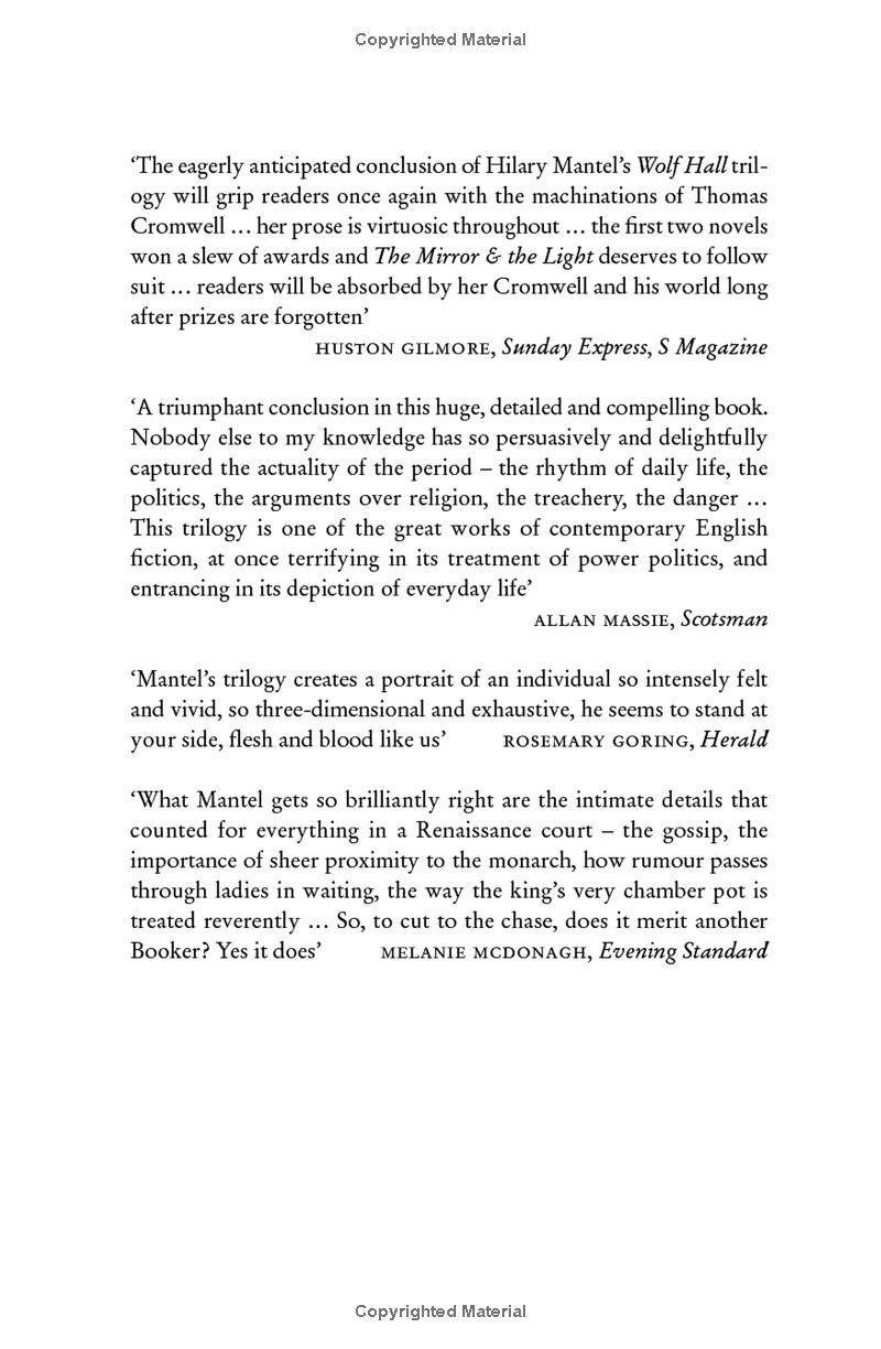 The Mirror & The Light The Sunday Times bestselling sequel to Wolf Hall and Bring Up the Bodies, the stunning conclusion to Hilary Mantel’s Man Booker Prize-winning Wolf Hall trilogy. A Guardian Book of the