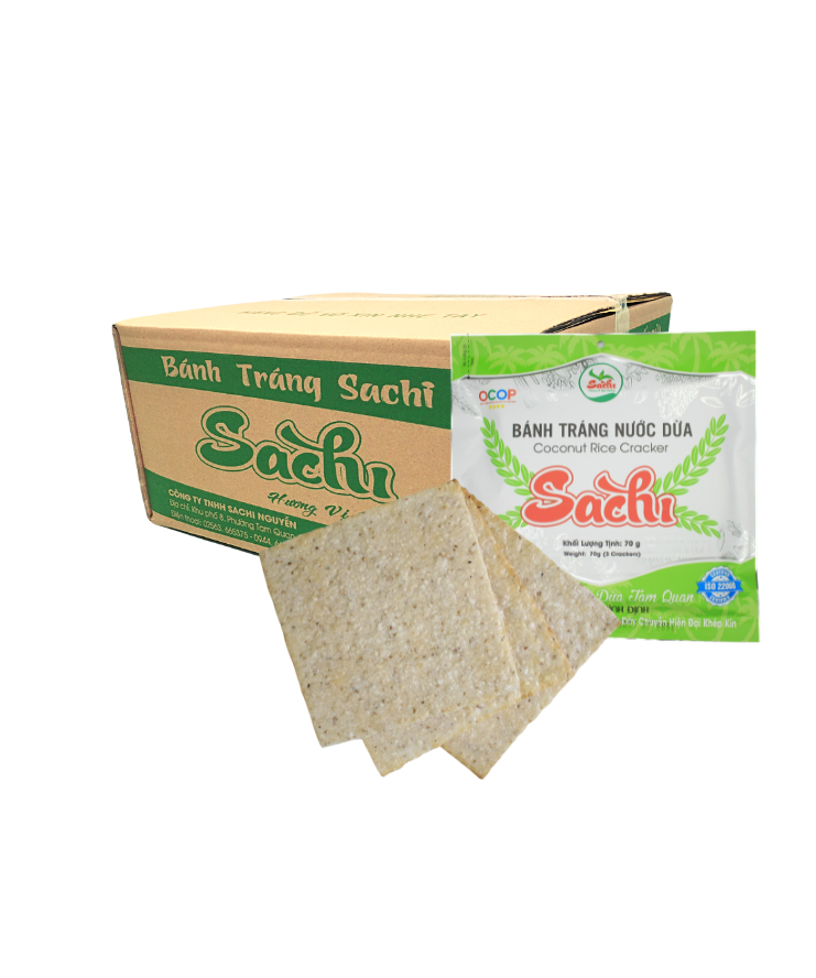 Bánh tráng nước dừa nướng sẵn Sachi xốp, giòn rụm, được sản xuất trên dây chuyền hiện đại khép kín, bánh nướng bằng điện vàng đều 2 mặt, bao bì hút chân không đảm bảo