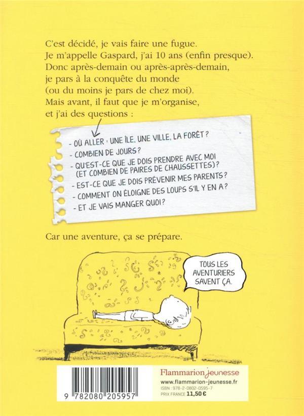C'est décidé, je vais faire une fugue. Je m'appelle Gaspard, j'ai 10 ans (enfin presque). Donc après-demain ou après-après-demain, je pars à la conquête du monde (ou du moins je pars de chez moi). Mais avant, il faut que je m'organise, et j'ai des questions : - Où aller : une île, une ville, la forêt ? - Combien de jours ? - Qu'est-ce que je dois prendre avec moi (et combien de paires de chaussettes) ? - Est-ce que je dois prévenir mes parents ? - Comment on éloigne des loups s'il y en a ? - Et je vais manger quoi ? Car une aventure, ça se prépare.