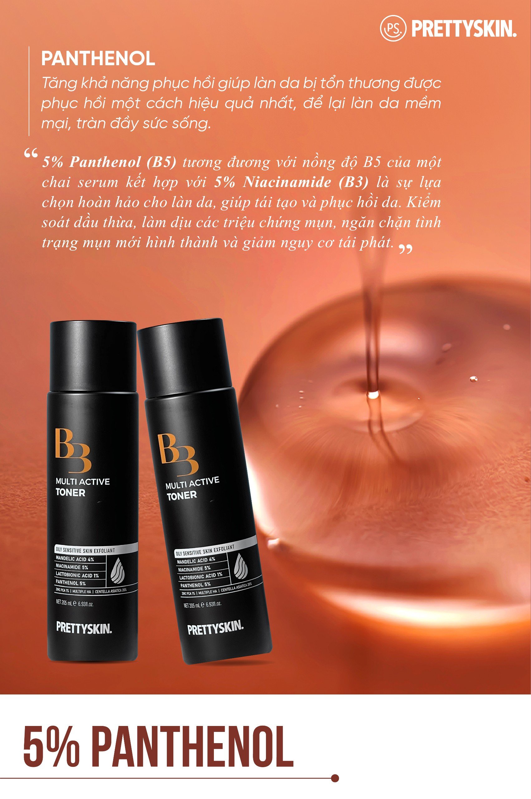 Toner đa di năng nhất hệ mặt trời - B3 Prettyskin   Tìm đâu ra 1 chiếc Toner có thể tẩy da chết một cách nhẹ nhàng lại có độ PH lý tưởng giúp cân bằng da, còn có thể kiểm soát dầu thừa, bã nhờn hiệu quả và đặc biệt chứa combo AHA-BHA-LHA loại bỏ hết cặn bẩn, bã nhờn cho da mịn màng, tươi sáng!   Mandelic Acid 4% với kích thước phân tử lớn nên không gây châm chích hoặc đỏ rát nhưng vẫn tẩy da chết hiệu quả, loại bỏ đi lớp tế bào sừng già Niacinamide 5% làm đều màu da, cải thiện các đốm sắc tố, chống oxy hóa, làm mờ thâm sẹo và se khít lỗ chân lông Lactobionic Acid 1% kích thích tăng sinh collagen, giảm sự tích tụ của melanin giúp cải thiện nếp nhăn và làm đều màu da Panthenol 5% tăng khả năng phục hồi giúp da nhanh chóng mềm mại, tràn đầy sức sống