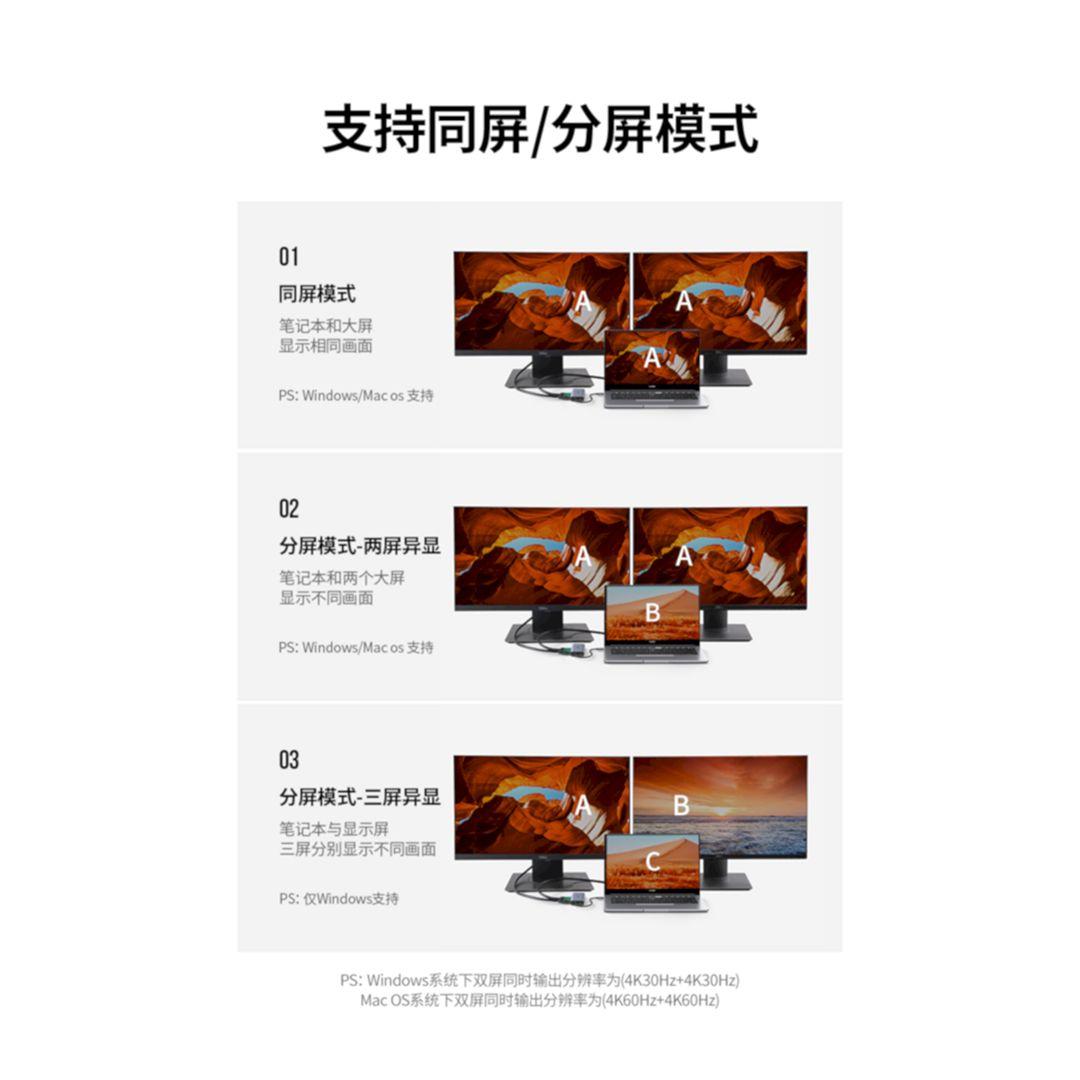 1. Đầu vào: USB Loại C 2. Đầu ra: 1*USB-A 3.0Female, 2*USB-A3.2, 1*USB-C 3.2,2*HDMI, 1*RJ45 Gigabit, 1*TF slot, 1*SD slot, 3.5mm, PD 3. HDMI 1 (màn hình ngoài đơn): Lên đến 4K@60Hz 4. HDMI 2