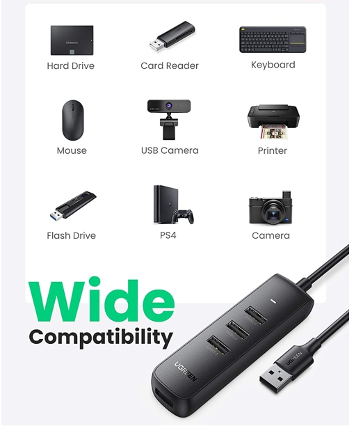 Ugreen 20277 1m 4 ports usb 2.0 hub with micro usb power port màu đen cr106 1. Input : USB-A 2. Output : 4 Port USB 2.0 . 3. Color : Black 4. Length :