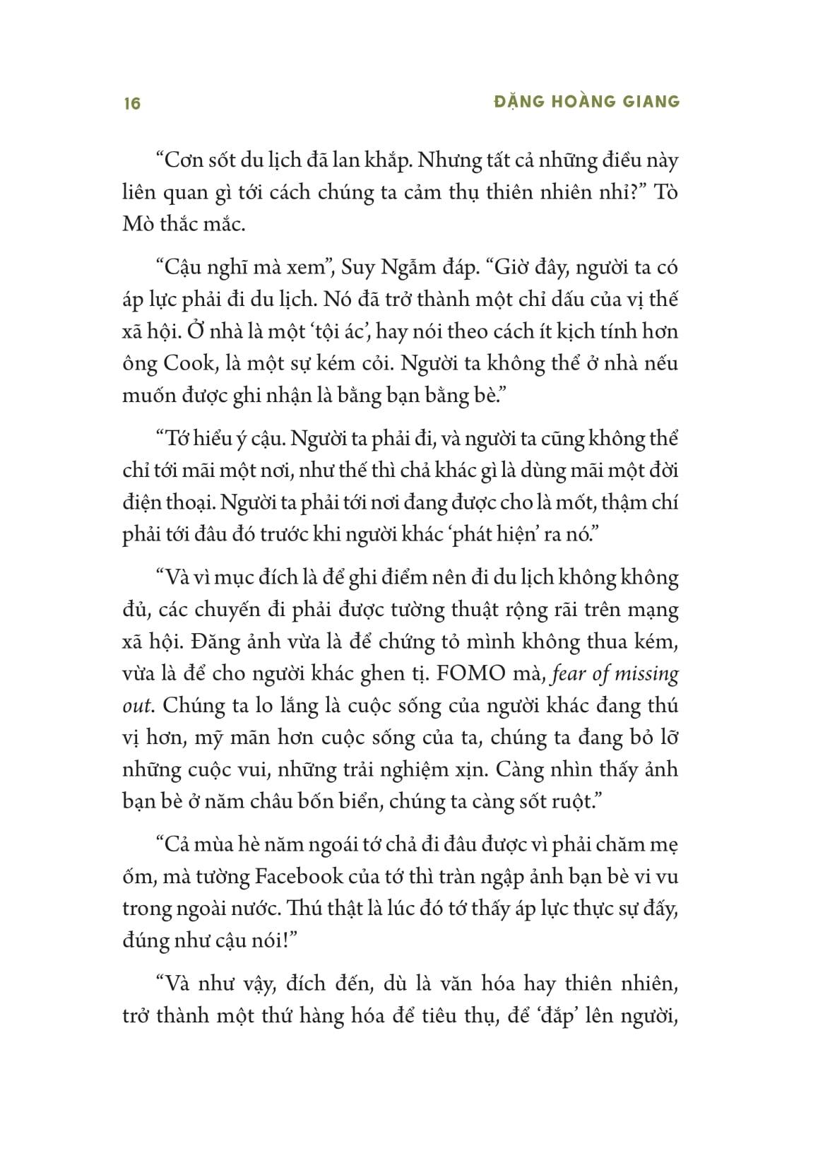 Từ bao giờ thiên nhiên gắn với hiện tượng du lịch đại chúng, xuất hiện cùng với sự phát triển của nhiếp ảnh và mạng xã hội? Từ bao giờ thiên nhiên tự thân đã bị biến đổi thành một thứ hàng hóa mà con người tiêu thụ thông qua hình ảnh và các trải nghiệm bề mặt? Từ bao giờ những đỉnh núi, bãi biển hay thảo nguyên trở thành phông nền phục vụ nhu cầu chụp ảnh của du khách, thay vì được nhìn nhận bởi tự thân chúng?
