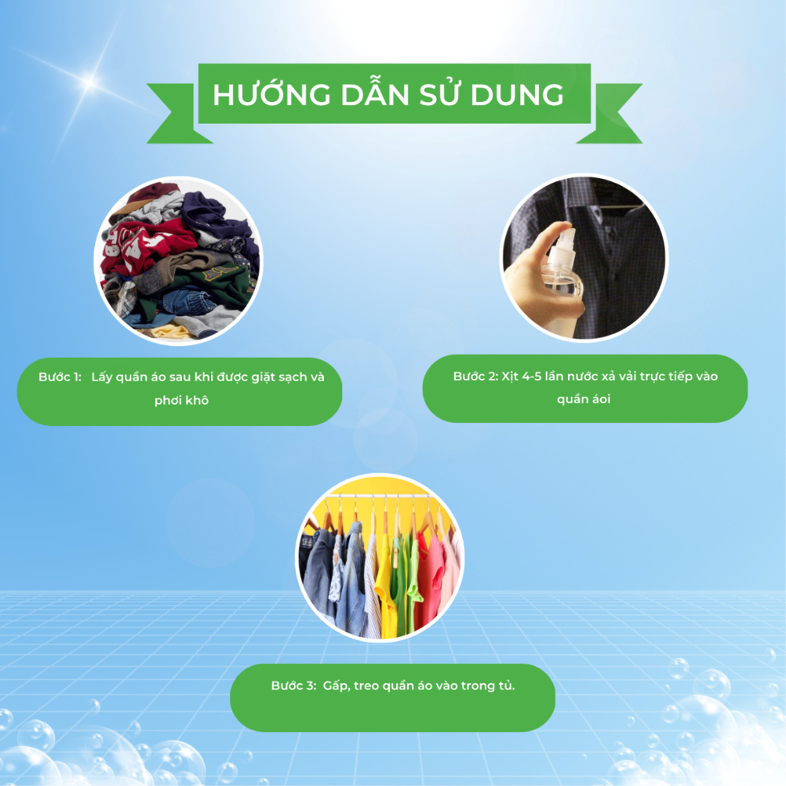 - Nước xả vải khô có ưu điểm có thể dùng trực tiếp trên quần áo mà không cần xả lại với nước. Sản phẩm này thường được dùng trong những trường hợp như mùa mưa áo quần dễ có mùi khó chịu. Hay trong những ngày mưa quần áo giặt nhưng không khô có mùi khó chịu thì việc sử dụng nước xả khô sẽ giúp bạn loại bỏ mùi hôi khó chịu. HƯỚNG DẪN SỬ DỤNG: